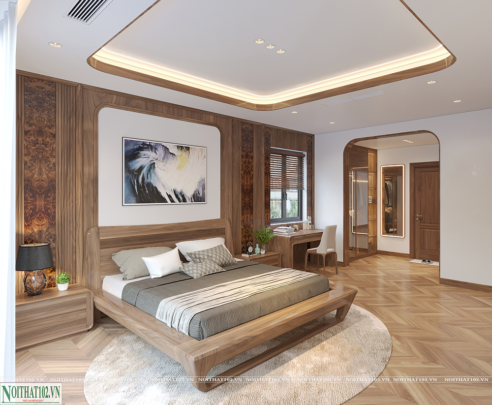 Phòng ngủ tại công trình EHIEN-HD10 được thiết kế tối giản, chú trọng cảm giác thư giãn và sự riêng tư. Giường ngủ gỗ óc chó tự nhiên, đầu giường vuông hoặc bo cong nhẹ, kết hợp cùng tủ quần áo, bàn làm việc, tab đầu giường đều được thiết kế đồng bộ về màu sắc và phong cách.