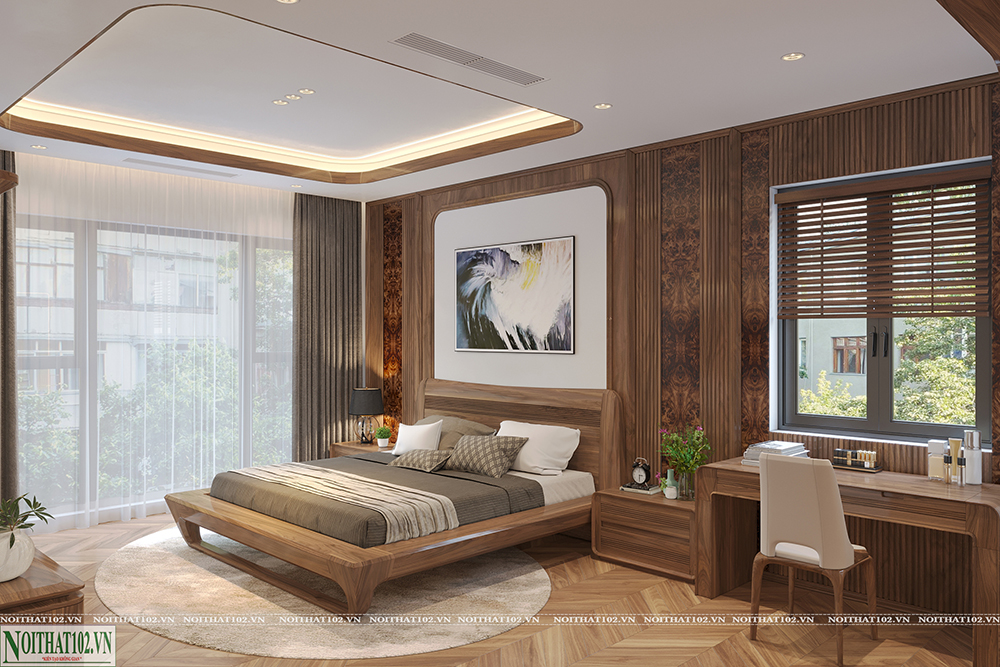 Dựa trên hiện trạng mặt bằng và yêu cầu của gia chủ, đội ngũ Nội Thất 102 đã đưa ra phương án thiết kế nội thất theo phong cách hiện đại, mạch lạc. Gỗ óc chó tự nhiên được lựa chọn xuyên suốt, giúp đồng bộ hóa màu sắc, kiểu dáng và chất liệu cho toàn bộ không gian.