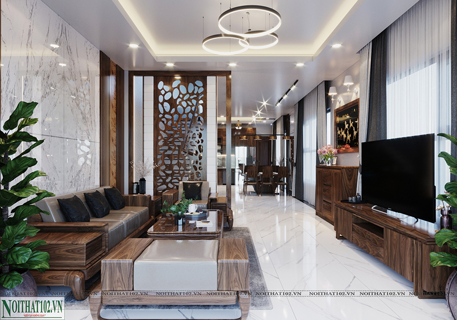 Không gian phòng khách sử dụng bộ sofa gỗ óc chó kết hợp nệm cao cấp, đi kèm bàn trà đồng bộ và kệ tivi gọn nhẹ. Vách ốp tường phía sau tivi hoặc phía sau sofa được xử lý khéo léo để tạo điểm nhấn thẩm mỹ.