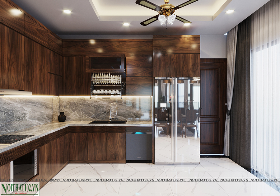 Phòng bếp của nhà anh Toán được thiết kế liền mạch với không gian ăn uống, giúp việc di chuyển, nấu nướng và dọn dẹp trở nên thuận tiện hơn. Tủ bếp được thiết kế kịch trần, sử dụng hệ cánh phủ veneer óc chó hoặc kết hợp cánh trắng hiện đại, tạo sự tương phản nhẹ nhàng mà sang trọng.