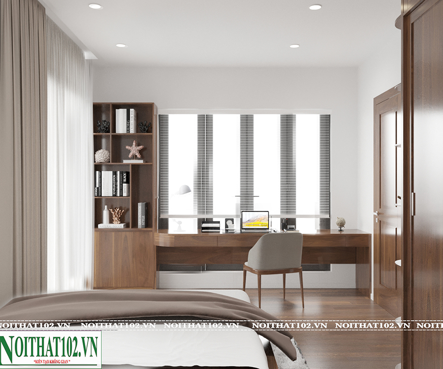 Màu sắc phòng ngủ được lựa chọn theo tông trầm nhẹ, kết hợp ánh sáng ấm để tạo cảm giác dễ chịu khi nghỉ ngơi. Nội thất thiết kế gọn gàng nhưng không đơn điệu, mang lại trải nghiệm sống chất lượng cho người sử dụng.