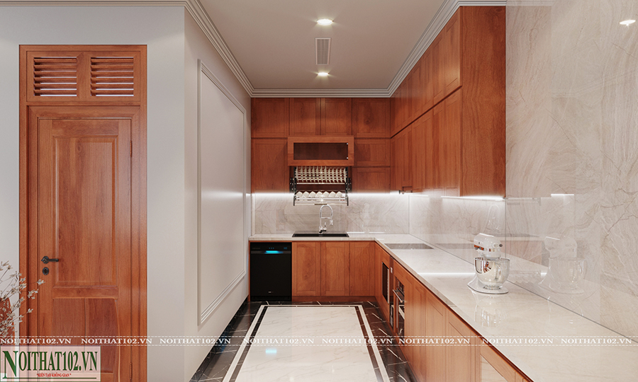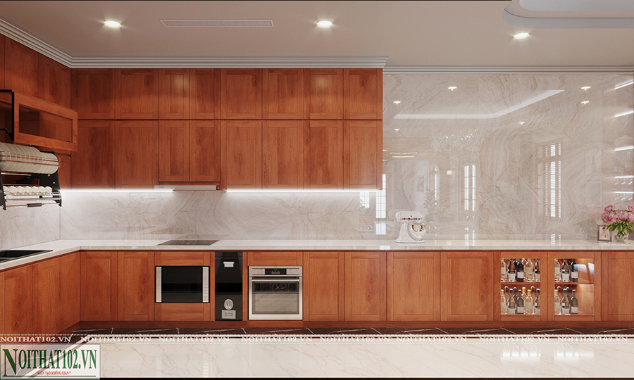 Tủ bếp được thiết kế theo phong cách hiện đại với khung gỗ gõ đỏ chắc chắn, bề mặt hoàn thiện tinh tế. Màu gỗ ấm phối cùng tông sáng giúp không gian bếp vừa sang vừa thoáng.