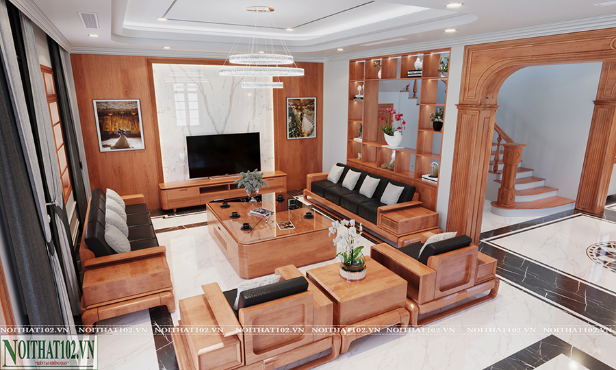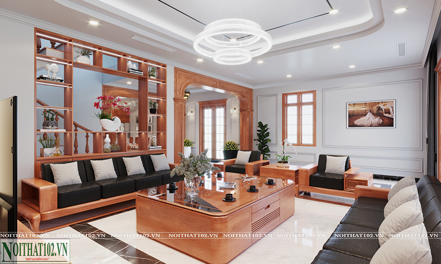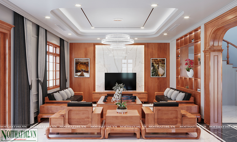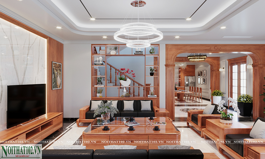 Phòng khách nổi bật với hệ nội thất gỗ gõ đỏ, nổi bật bởi vân gỗ lớn, màu sắc ấm và độ bền vượt trội. Bộ sofa bọc da kết hợp bàn trà mặt đá; hệ vách gỗ, lam trang trí và đèn trần hiện đại tạo nên tổng thể sắc sảo, đậm chất biệt thự cao cấp.
