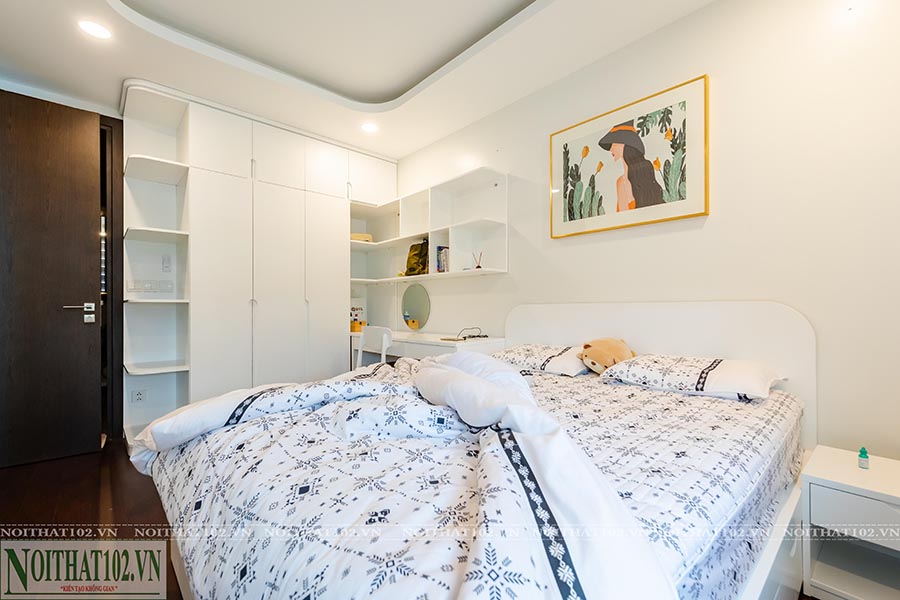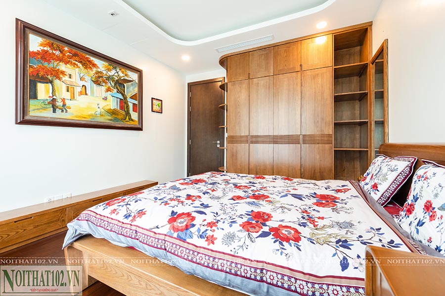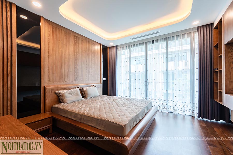 Giường ngủ được thiết kế riêng theo diện tích phòng, kết cấu vững chắc, đầu giường bọc da, hạn chế chi tiết rườm rà. Tủ áo âm tường, tab đầu giường, bàn trang điểm đều sử dụng gỗ óc chó lắp ráp đồng bộ, kết hợp ánh sáng đèn led để tăng chiều sâu không gian.