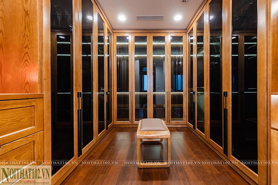 Tủ thay đồ được bố trí thành các module rời, nhiều ngăn chứa, có khu vực để phụ kiện và túi xách. Thiết kế không cánh (open closet) kết hợp kính và đèn hắt giúp gia chủ dễ chọn đồ, đồng thời tạo cảm giác sang trọng như trong các boutique thời trang.