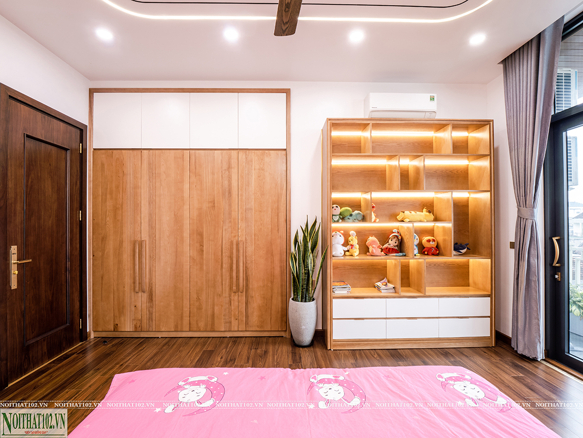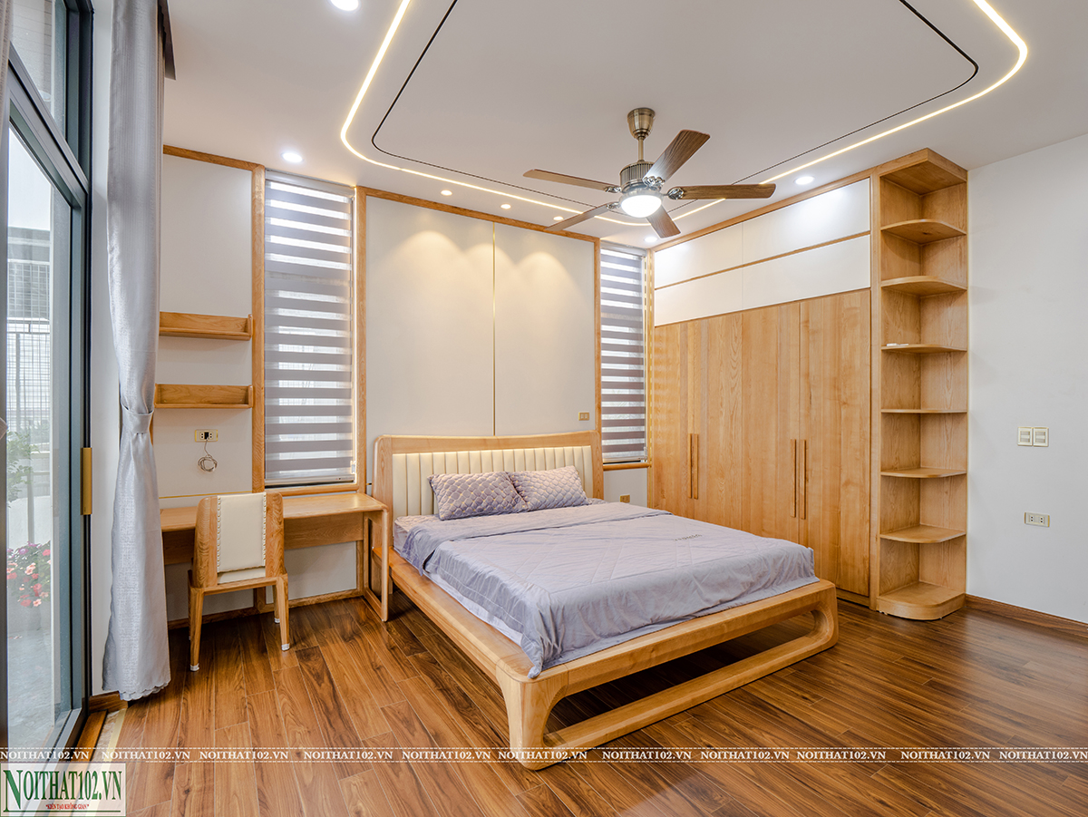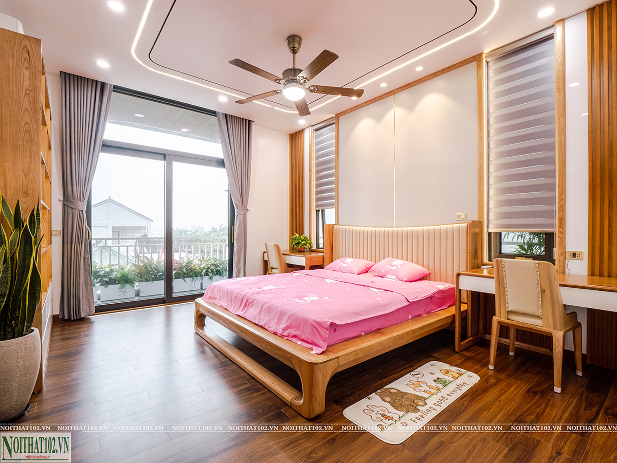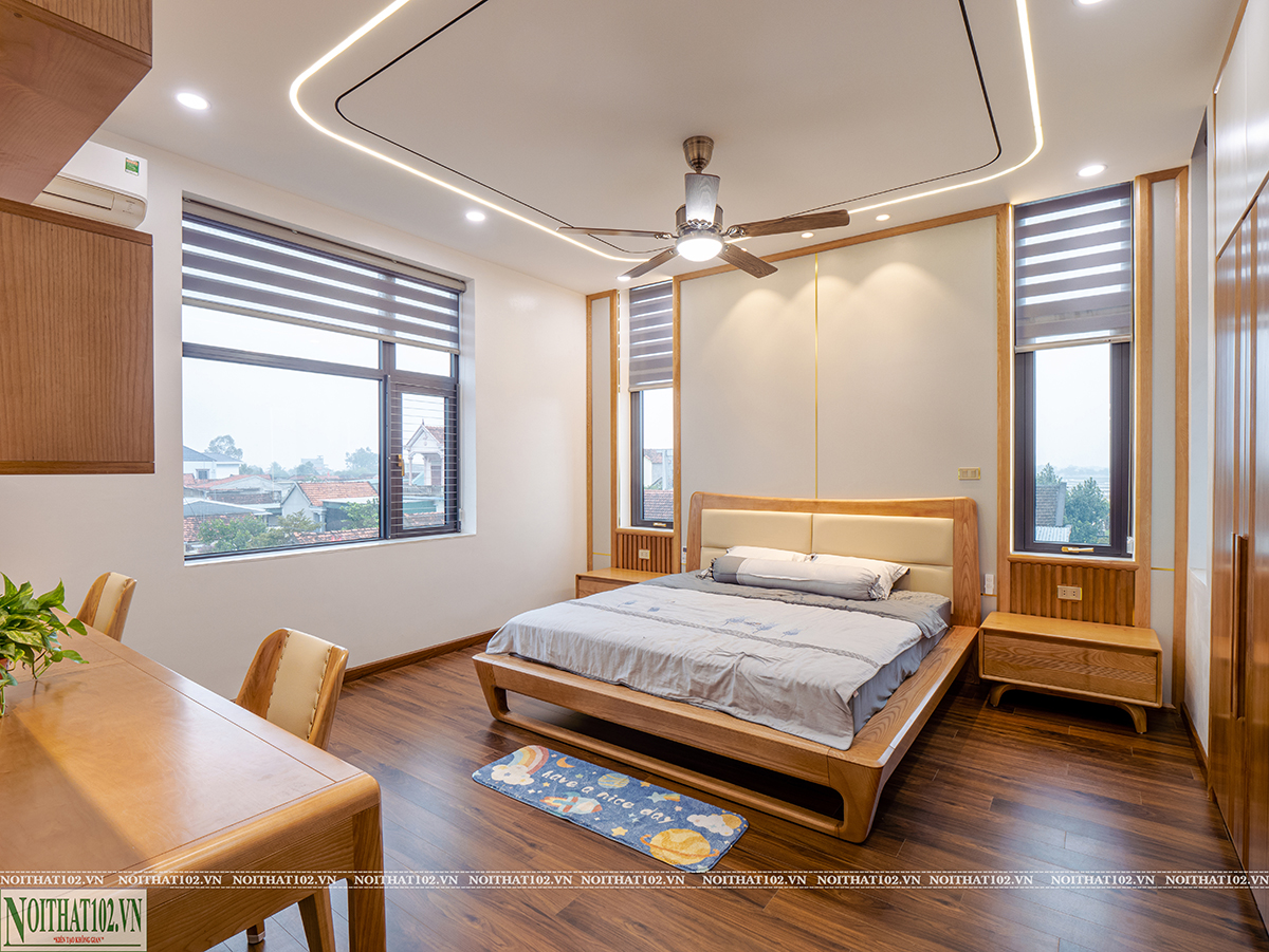 Phòng ngủ được thiết kế theo nhu cầu sử dụng thực tế của từng thành viên trong gia đình. Mỗi phòng đều có giường ngủ, tủ đồ, bàn làm việc hoặc bàn trang điểm được bố trí hợp lý.