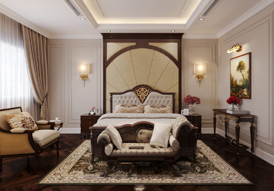 Phòng ngủ trong phong cách tân cổ điển nhà anh Ninh hướng đến sự thư thái và trang nhã. Giường ngủ thiết kế cao, vách đầu giường có thể bọc da hoặc nhung theo phong cách cổ điển. Các chi tiết như tủ đồ, bàn trang điểm hay tab đầu giường được phối hợp cùng tông, tạo cảm giác đồng bộ và dễ chịu.
