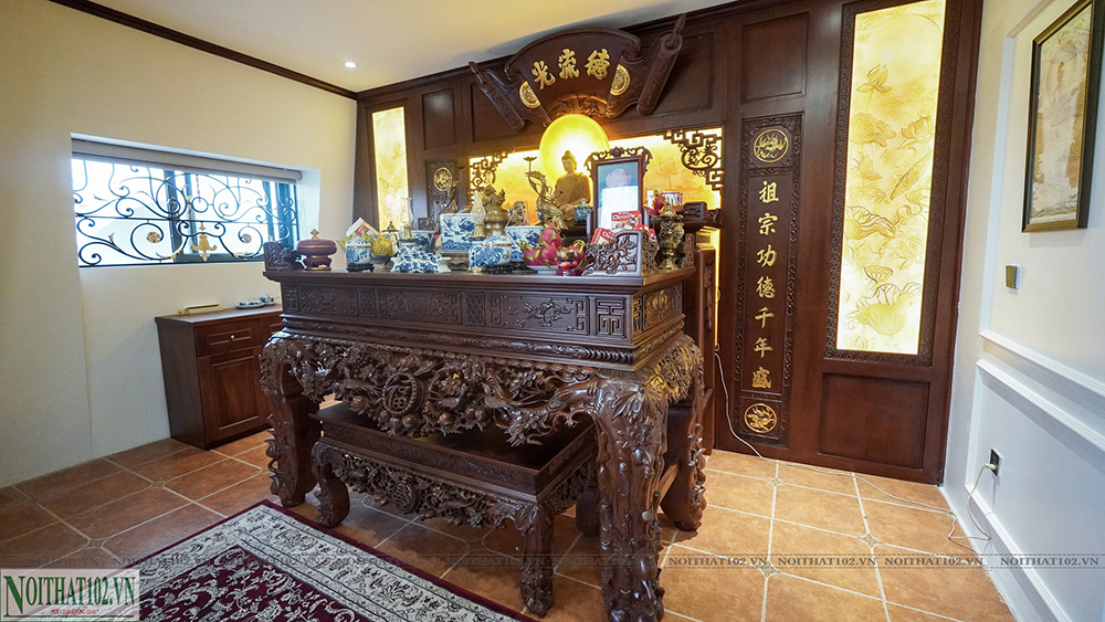 Phòng thờ là không gian tâm linh quan trọng trong biệt thự. Nội Thất 102 thiết kế theo nguyên tắc: giữ sự tôn nghiêm, đơn giản, nhưng vẫn nhất quán với tổng thể tân cổ điển của công trình.