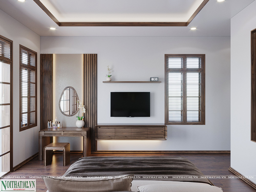Tab đầu giường, bàn trang điểm, tủ âm tường đồng bộ cùng chất liệu để tạo sự liền mạch.