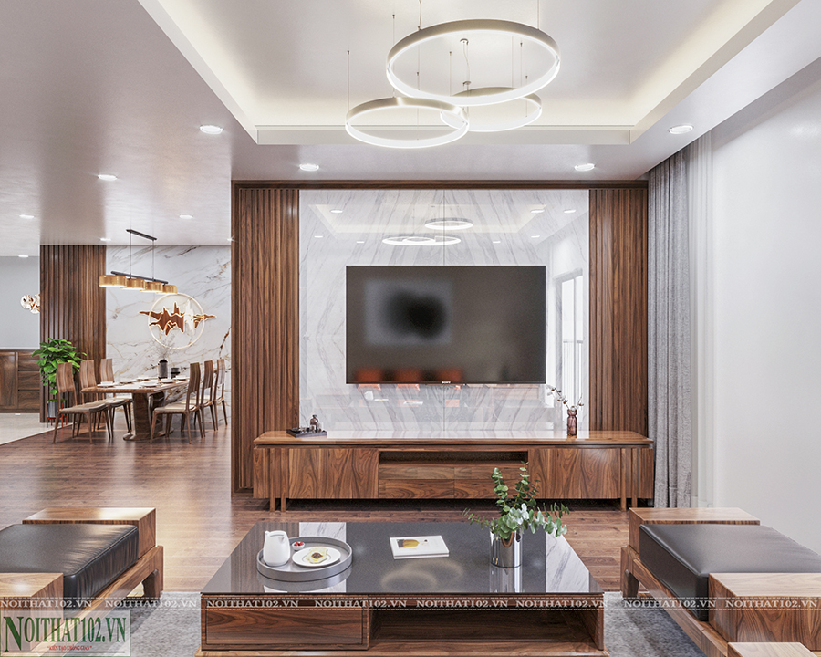 Thiết kế và thi công nội thất chung cư cao cấp Ciputra – công trình của anh Lành – là một trong những dự án trọn gói tiêu biểu do Nội Thất 102 thực hiện. Với không gian gồm phòng khách, bếp và phòng ngủ, toàn bộ nội thất được hoàn thiện bằng gỗ óc chó tự nhiên theo phong cách hiện đại, sang trọng và tinh tế.