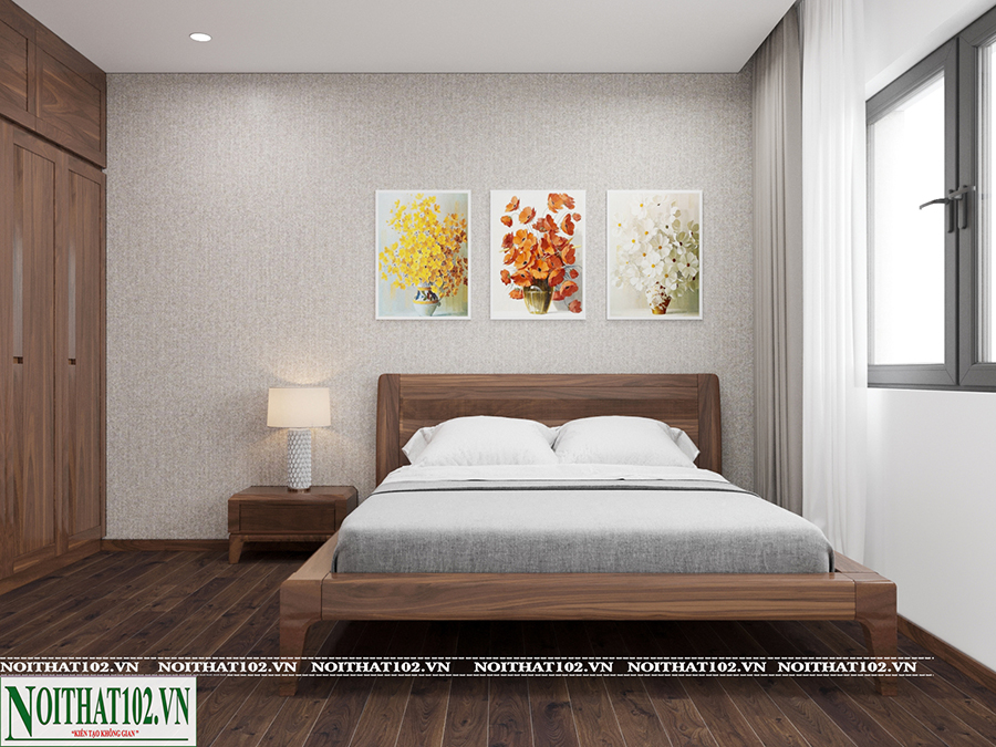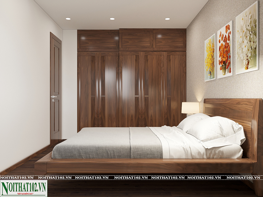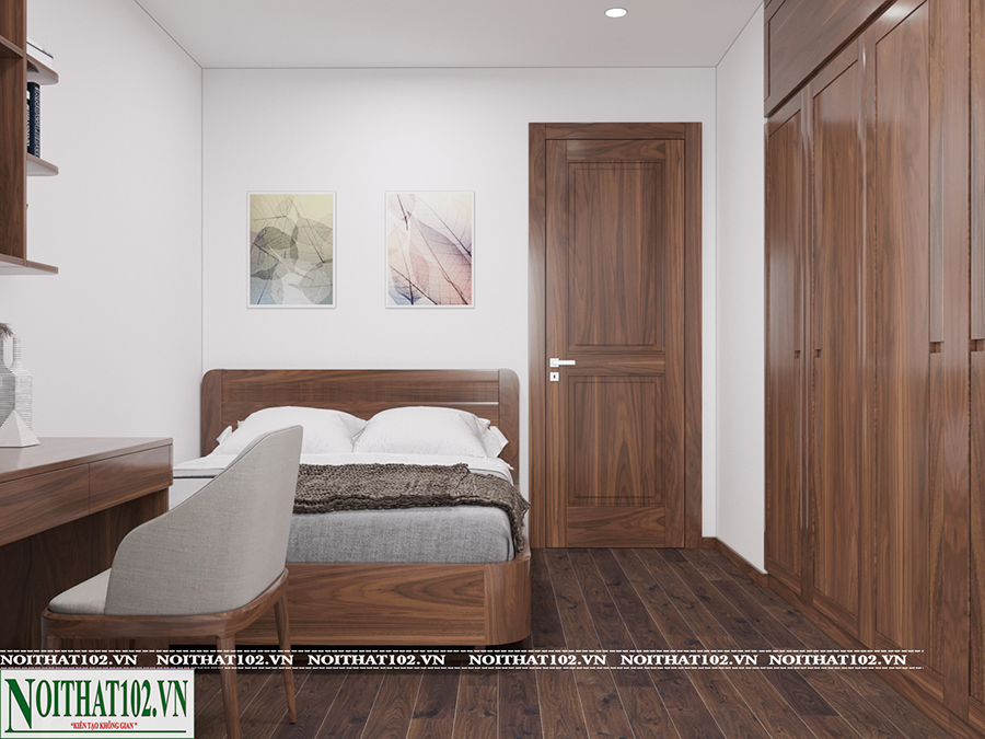 Phòng ngủ của căn hộ tại Ciputra được thiết kế theo xu hướng tối giản nhưng đầy đủ tiện nghi. Giường ngủ gỗ óc chó thiết kế dáng thấp, đầu giường bọc da hoặc giữ nguyên vân gỗ tự nhiên. Kệ đầu giường, bàn trang điểm hoặc bàn làm việc đều được thiết kế đồng bộ, giúp tổng thể không gian hài hòa.