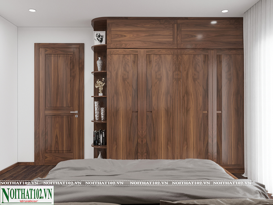 Nội Thất 102 sản xuất toàn bộ đồ nội thất tại xưởng riêng, sử dụng gỗ óc chó đã qua xử lý chống cong vênh, mối mọt. Việc thi công tại công trình diễn ra đúng tiến độ, tuân thủ bản vẽ thiết kế 3D đã được duyệt, từng chi tiết được hoàn thiện sắc nét và bền vững.